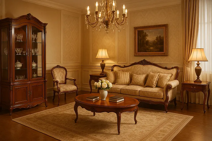 Классическая мебель представляет собой воплощение многовековых традиций мебельного искусства, где каждый элемент создается по канонам симметрии, безупречных пропорций и ордерных мотивов античного наследия. В основе философии создания лежат фундаментальные принципы — использование исключительно натуральных материалов премиального качества, применение традиционных столярных техник и создание рукотворного декора высочайшего уровня мастерства.