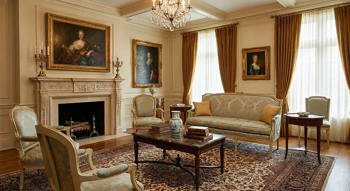 Сценарий 1: Светлая классика. Стены кремовые или светло-серые. Мебель белая или слоновая кость с золотой патиной. Диван и кресла с бежевой или серой обивкой. Шторы тяжёлые, шёлковые, цвета шампанского. Молдинги и карнизы белые. Пол паркет средний (дуб натуральный). Фурнитура золотая. Светильники латунные. Результат: светлая, воздушная, элегантная гостиная.