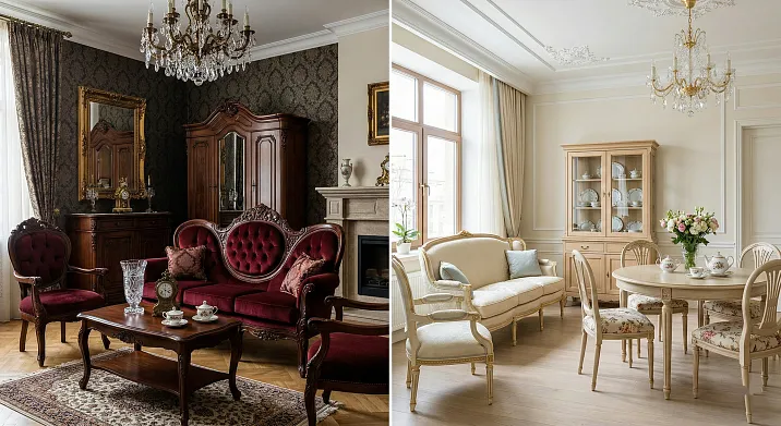 Классика — конкретные исторические стили XVII–XIX веков с точными правилами декора. Неоклассика — современная интерпретация классических принципов с упрощённым декором и чистыми линиями.