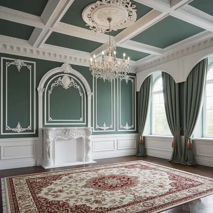 Цвет карниза в классическом интерьере обычно белый или близкий к цвету потолка. Белые карнизы на цветных стенах создают четкую визуальную раму. Позолоченные карнизы характерны для роскошных барочных и ампирных интерьеров, создают эффект дворцовой пышности.