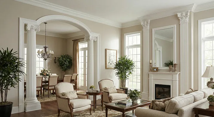 Пилястры работают как вертикальные разделители пространства. Они создают ритм на длинной стене, обрамляют дверные и оконные проёмы, выделяют функциональные зоны, визуально поднимают потолки. В маленьких помещениях пилястры предпочтительнее колонн — они не крадут пространство, но дают тот же архитектурный эффект.