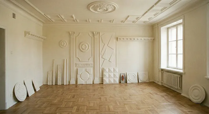 Комплексное оформление требует точного расчёта количества материалов. Карнизы — периметр помещения плюс 10% на подрезку и запас. Молдинги — общая длина всех рамок и панелей плюс 15% на углы и стыки. Розетки, накладки, пилястры — поштучно по проекту.