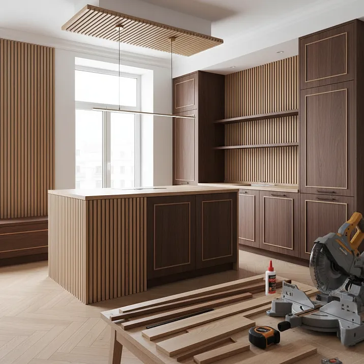 Декоративные панели на боковых стенках — кухонный остров или полуостров часто имеет открытые боковые стороны, которые требуют декоративного оформления. Плоская боковина из ЛДСП или окрашенного МДФ выглядит как техническая поверхность. Та же боковина с наклеенными вертикальными рейками, образующими ритмическую структуру, превращается в архитектурный элемент, который связывает остров с остальной композицией кухни.