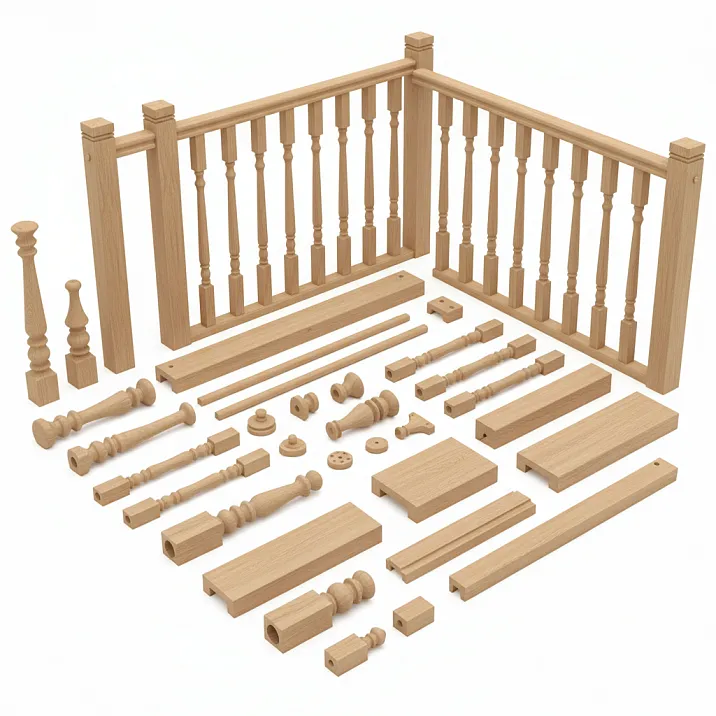 Материалы: деревянные балясины точёные или резные из дуба, ясеня, бука; металлические из нержавеющей стали, алюминия, кованого железа; стеклянные панели, заменяющие традиционные балясины.