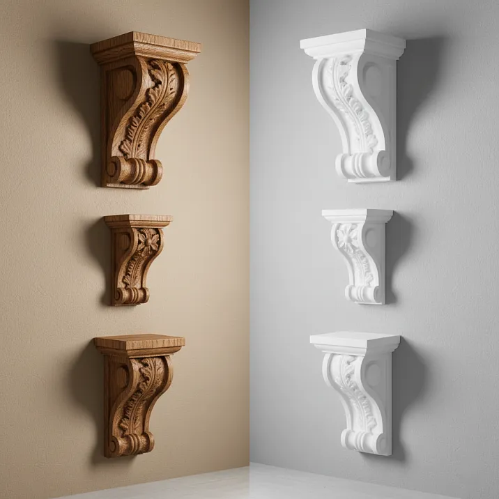 Современный полиуретан революционизировал производство архитектурного декора. Кронштейны из полиуретана сочетают эстетику классической резьбы с практичностью современных материалов. Метод прецизионного литья воспроизводит любые формы с ювелирной точностью, создавая изделия, внешне неотличимые от деревянных или гипсовых аналогов.