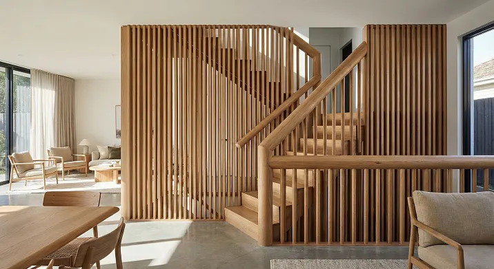 Другой приём — использование реечной перегородки в пространстве рядом с лестницей. Допустим, лестница выходит в гостиную-студию, и вам нужно деликатно отделить прихожую зону от жилой. Реечная конструкция справится с этой задачей идеально, а если её выполнить из той же породы дерева, что и поручень круглый 50 мм, возникнет визуальная связка, объединяющая разные зоны в единое целое.
