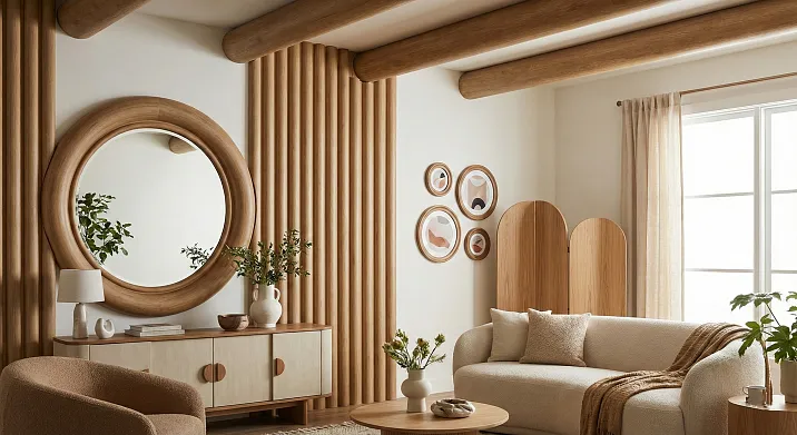 Рама для зеркала — ещё один яркий пример использования круглого погонажа. Зеркало в интерьере всегда играет роль расширителя пространства. Если обрамить его поручнем круглым деревянным 50, получится не просто функциональный предмет, а декоративный акцент, который задаёт тон всему помещению.