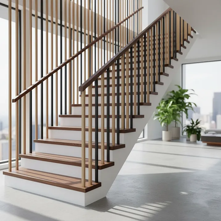 Прямоугольный поручень + квадратные балясины: современная лаконичность, чёткие линии, подходит для минимализма, скандинавского стиля, лофта.