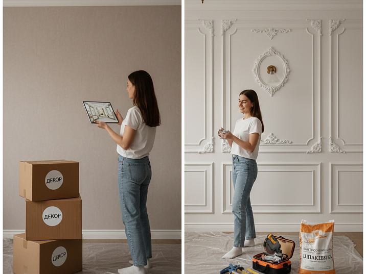 Результат: комната обретает завершённость, появляется архитектурная структура. Скромные вложения, но эффект заметен.
