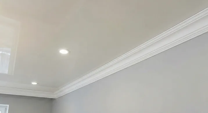 Некоторые производители натяжных потолков предлагают специальную маскировочную ленту (гибкую вставку), которая закрывает зазор между полотном и стеной. Но если используется полиуретановый карниз, эта лента не нужна — карниз полностью закрывает технологический зазор, создавая эстетичный переход.