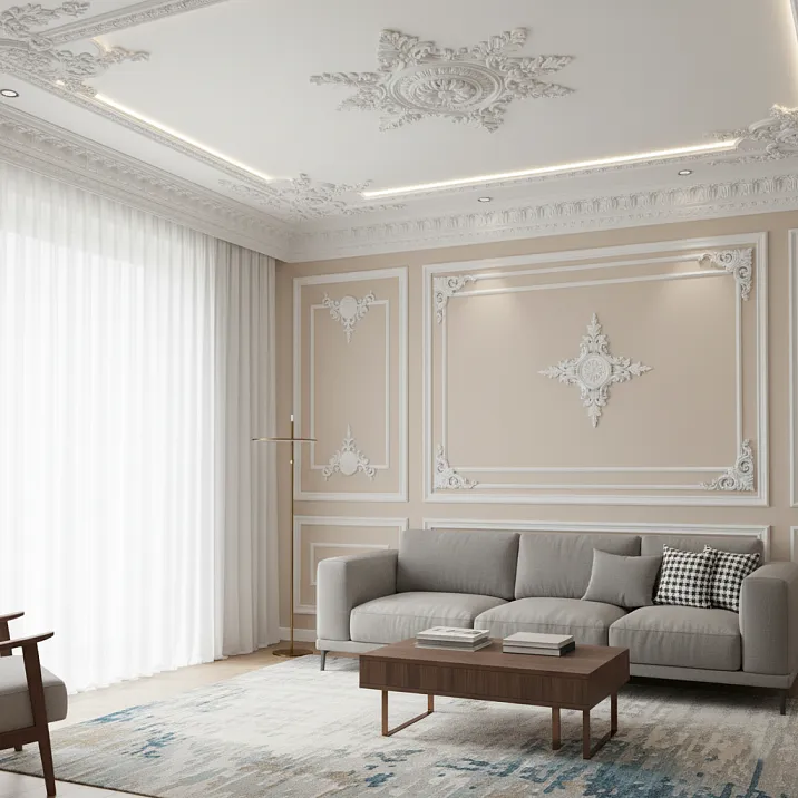А теперь представьте ту же гостиную, но с другим решением. За телевизором - стена, разделенная молдингами из полиуретана на прямоугольные панели. Центральная панель выделена темным цветом, в ней утоплен телевизор - он стал частью архитектурной композиции. По бокам от ТВ-зоны - вертикальные пилястры со скрытой подсветкой, создающей мягкие блики. Над диваном - горизонтальные молдинги, образующие рамки, внутри которых картины или зеркала. Вся эта система связана с потолочным карнизом и напольным плинтусом через повторение профилей и ритмов. Гостиная ожила. Появился масштаб, структура, игра света и тени.