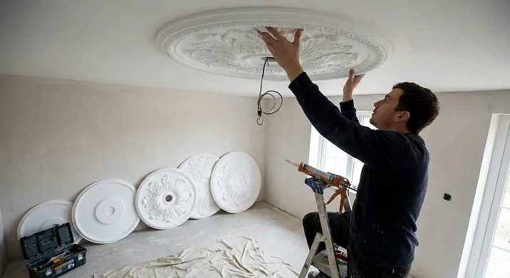Если розетка крупная (диаметр более 80 сантиметров), работайте вдвоем. Один держит центр, другой прижимает по периметру, двигаясь по кругу. Это обеспечит равномерное прилегание без воздушных пузырей.