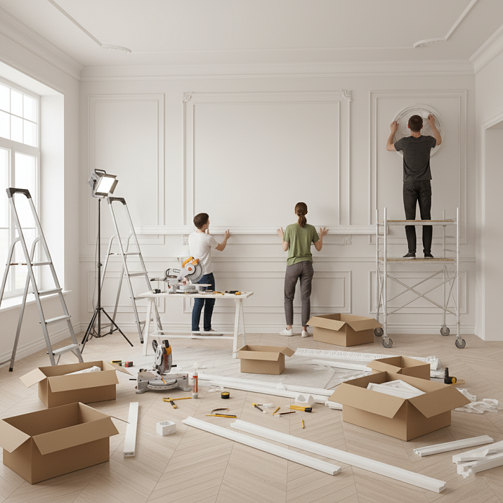 Интерьер без архитектурной структуры — это коробка с мебелью. Стены — плоские поверхности, потолок — белое пятно над головой, углы — случайные пересечения плоскостей. Такое пространство функционально, но безлико, лишено глубины, характера, истории. Лепнина декор преображает эту ситуацию за считанные дни, без мокрых процессов, штукатурки, многомесячного ремонта. Карнизы создают завершение вертикалей, молдинги структурируют стены, розетки организуют центры композиций, пилястры имитируют колонны. Результат — из типовой квартиры рождается пространство с архитектурной логикой, пропорциями, ритмом.