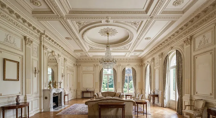 Орнаментальное единство. Все элементы — карниз, молдинги на потолке, стеновые молдинги, пилястры — принадлежат одному орнаментальному языку. Если карниз классический с акантовым листом, то стеновые молдинги не могут быть геометрически-минималистичными. Орнамент должен быть одним на всём пространстве.