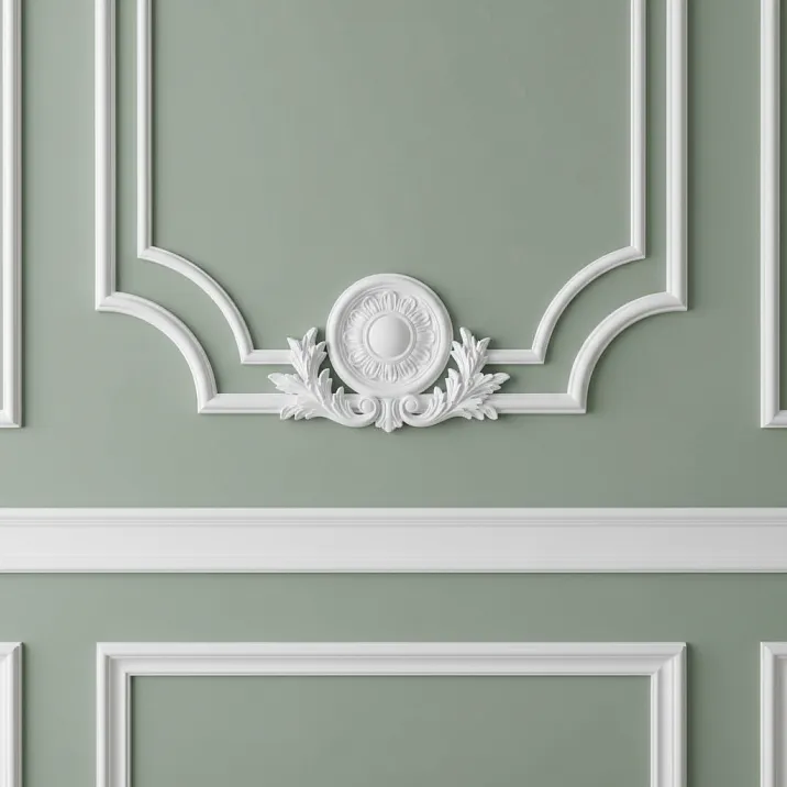 Окраска — если элементы не окрашены производителем, их красят после установки. Сначала грунт, затем краска — обычно акриловая водоэмульсионная. Можно красить в тон стен, можно контрастно. Для имитации старинной лепнины используются патины, глейзы, позолота.