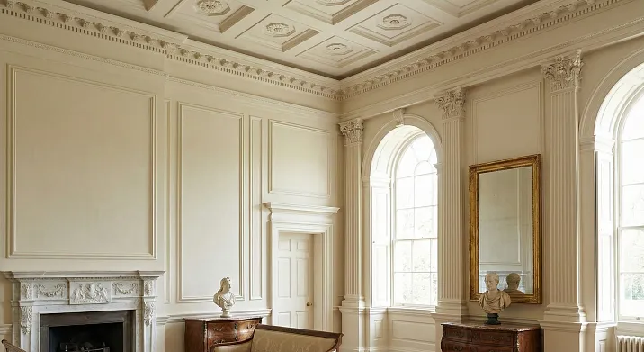 Неоклассика предпочитает сдержанность. Розетки проще, орнамент минимален, но чёткость линий и пропорций безупречны. Потолочная лепнина розетка в неоклассическом стиле часто представляет собой систему концентрических кругов с лаконичными желобками и бусинами.