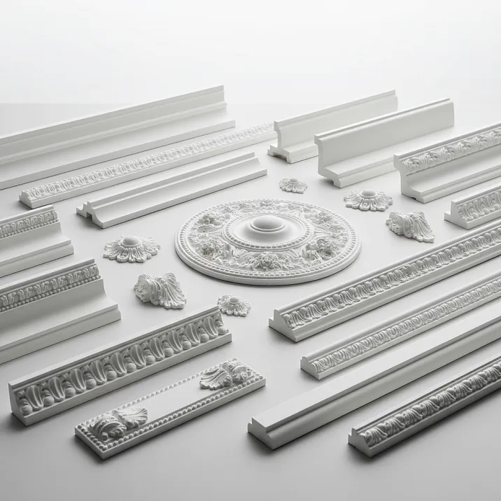 Гипс — премиум-сегмент. Гипсовые карнизы стоят от восьмисот до трёх тысяч рублей за метр. Розетки — от двух до двадцати тысяч рублей. Гипс экологичен, «дышит», передаёт мельчайшие детали резьбы. Но тяжёл, хрупок, боится влаги, требует профессионального монтажа.