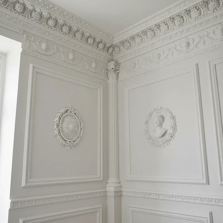 Рассчитайте количество материала: погонные метры карнизов и молдингов, количество штучных элементов (розетки, накладки). Не забудьте добавить 10-15% на подрезку и возможные ошибки.