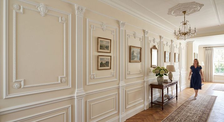 Холл в загородном доме или прихожая в большой квартире — это нередко длинный прямоугольный объём. Стена справа или слева тянется на 4–6 метров. Без деления это туннель. С молдинговыми секциями — это архитектурный коридор с характером.