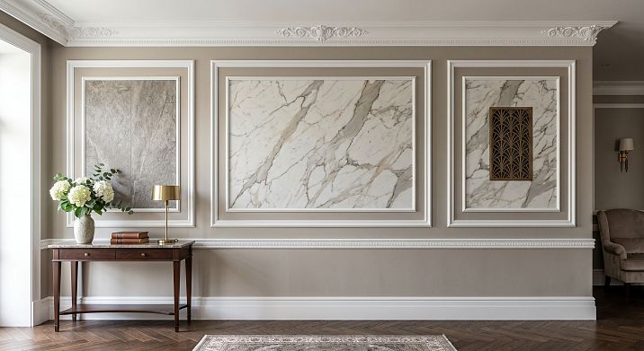 Лучший вариант — рамка из молдингов вокруг мрамора: средний или широкий профиль в тон стены или с мягким контрастом. Для неоклассики — с угловыми вставками и декором для молдингов. Для современной классики — гладкий профиль без орнамента, строгая геометрия.