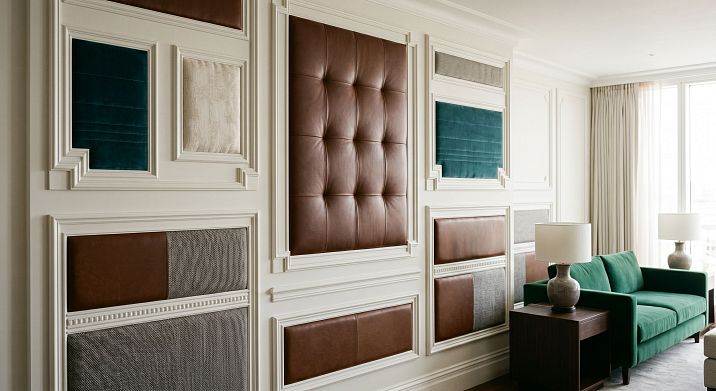 Ключевое правило: чем больше мягких панелей, тем проще молдинги — и наоборот. Если стена насыщена фактурой (велюр, бархат, тиснение), молдинги должны быть строгими, лаконичными, в тон. Если молдинги выразительные (угловые вставки, накладки, двойная рамка) — ткань должна быть спокойной, однотонной.