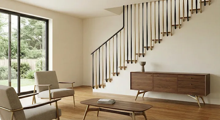 Начните с лестницы — она архитектурно доминирующий элемент. Выберите стиль, соответствующий общей концепции дома. Классический особняк требует точёных балясин традиционного профиля. Современный дом — геометрических форм. Эклектичное пространство допускает смелые миксы.