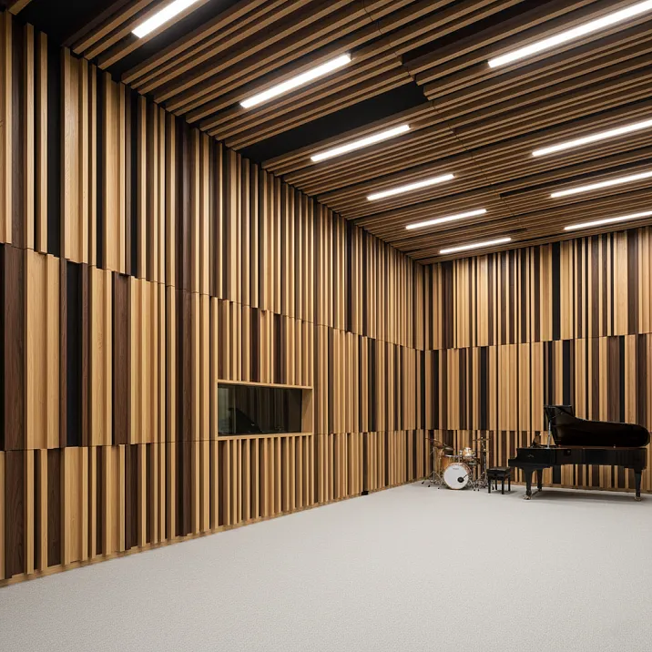Студия звукозаписи требует максимально контролируемой акустики с минимальными отражениями. Все поверхности должны быть либо поглощающими, либо диффузными. Зеркальных отражений быть не должно. Обширные панели из реек с глубокими поглотителями на всех стенах и потолке создают профессиональную среду записи. Басовые ловушки в углах контролируют низкие частоты.