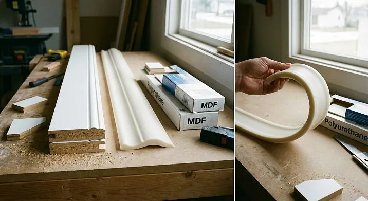 Оба материала долговечны. МДФ чуть более стабилен по геометрии, полиуретан устойчивее к механическим воздействиям и влаге.
