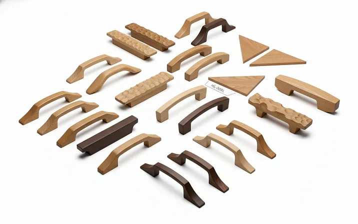 Дерево: Тёплое, приятное на ощупь, экологичное. Деревянные элементы в интерьере создают уют, естественность. Ручки из массива дуба, ясеня, ореха подходят для эко-стиля, скандинавского, кантри. Требуют защитного покрытия (лак, масло) для влагостойкости и защиты от загрязнений. Менее долговечны, чем металл, но ремонтопригодны — можно отшлифовать, покрыть заново.