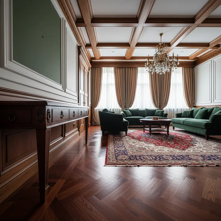 В комнатах с высокими потолками (от 3 метров и выше) уместен широкий плинтус — 100-120 мм. Он уравновешивает вертикальный масштаб, делает пространство более человечным. Представьте парадную гостиную с четырёхметровыми потолками и узким плинтусом — он просто потеряется, стены будут казаться бесконечными. А широкий деревянный плинтус создаст благородную основу, визуально «приземлит» помещение.