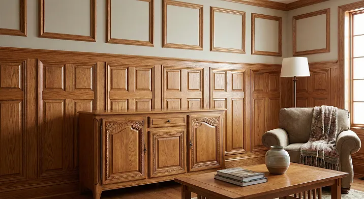 Стоимость складывается из цены молдингов (от 300 до 2000 рублей за погонный метр в зависимости от профиля и породы), подготовки стен, монтажа, финишной отделки. В среднем оформление одной стены площадью 15-20 м² обходится в 50-100 тысяч рублей с материалами и работой. Эксклюзивные резные молдинги увеличивают стоимость в 2-3 раза.