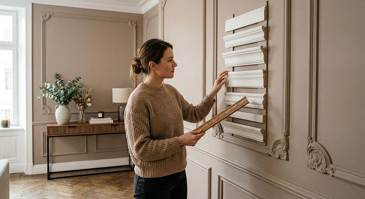 Если стены планируется красить — выбирайте молдинг под покраску из МДФ или массива. Если стены покрыты шпоном или натуральным деревом — ищите молдинг из того же вида древесины для единства текстуры. Для стен с обоями молдинг монтируется поверх и должен быть достаточно плотным, чтобы надёжно прилегать к поверхности.