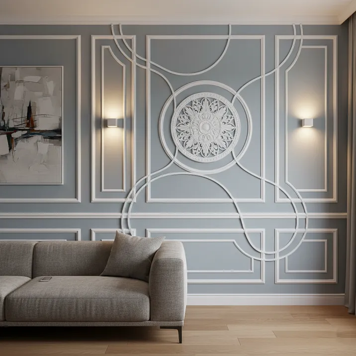 Используйте розетки в центре панелей, образованных молдингами. Угловые элементы с растительным орнаментом разместите в точках пересечения профилей. Такая композиция требует тщательного планирования и чувства меры, но результат впечатляет своей архитектурной выразительностью.