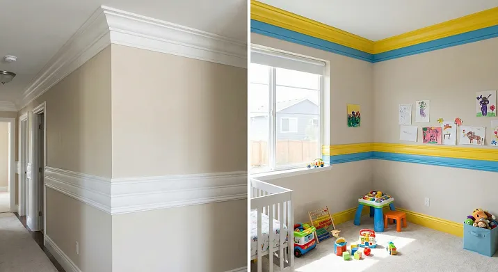Цветовое решение: для детской можно отойти от традиционного белого. Плинтусы и молдинги, окрашенные в яркие цвета или в тон стен, создают игривую атмосферу. Главное — использовать краски на водной основе без запаха и вредных веществ, быстросохнущие и безопасные.