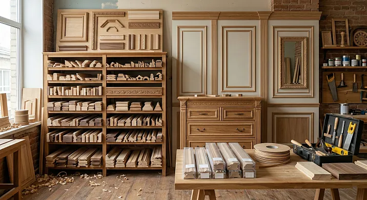 Молдинг деревянный — это профильная погонажная планка из массива дуба, бука или МДФ. Казалось бы, скромный элемент. Но именно он отличает мебель ручной работы от конвейерного производства, а профессиональный интерьер — от случайного набора вещей. В этой статье — полный разбор: что такое мебельный молдинг, какие виды бывают, как крепить на фасады и стены, чем деревянный лучше полиуретанового и как правильно выбрать финишную отделку.