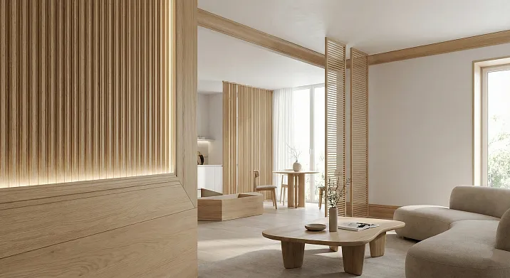 Вертикальные деревянные планки — один из главных трендов. Они используются для создания акцентных стен, зонирования, декорирования изголовий кроватей. Планки монтируются с равномерным шагом (обычно с просветами, равными ширине планки или чуть больше), создавая ритмичную структуру.