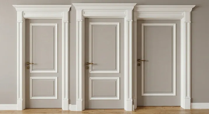 Ширина наличника обычно больше ширины молдинга на двери — это создаёт визуальную иерархию и подчёркивает границу проёма. Стандартная ширина наличников — 60-100 мм, но возможны и более широкие варианты для парадных порталов.