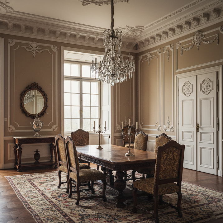 В столовой зоне молдинги создают камерную атмосферу, выделяют обеденный стол как композиционный центр. Вертикальные молдинги-пилястры по углам обеденной зоны формируют иллюзию отдельного помещения внутри кухни-студии. Обрамление буфета или серванта молдингами превращает мебель в архитектурный элемент, интегрирует её в стены, создаёт эффект встроенной классической мебели.