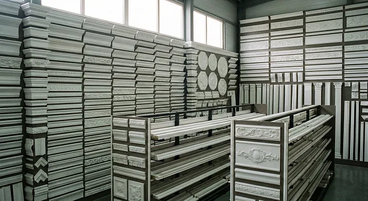 Вес: полиуретан плотностью 280-350 кг/м³ (качественные европейские системы BASF, Huntsman) легче гипса (1200-1400 кг/м³) в 4-5 раз, легче дерева (дуб 700 кг/м³, сосна 500 кг/м³) в 2-3 раза. Молдинг шириной 100 мм длиной 240 см из полиуретана весит 0,8-1,2 кг, из гипса 4-6 кг, из дерева 2-3,5 кг. Лёгкость упрощает монтаж (клеится на стену без усиления конструкций, один человек устанавливает 20-30 метров за день), транспортировку (доставка из Москвы в регионы 2500-8500 руб., гипс тяжелее — доставка дороже на 40-70%), хранение (штабеля молдингов на складе не требуют усиленных полок, не проваливаются).