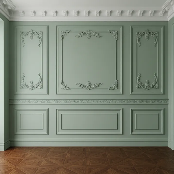 Акцентные панели — одна стена (или её часть) оформляется молдингами и накладками, создавая визуальный центр комнаты. Остальные стены остаются простыми. Это позволяет сконцентрировать внимание, не перегружая пространство.
