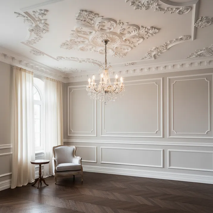 Потолочная лепнина в концепции минимал-орнамента выполняет роль знака препинания в архитектурном предложении. Она не перекрикивает пространство, а деликатно его организует. Тонкий карниз шириной 80-120 мм с едва заметным рельефом, розетка диаметром 400-500 мм с классическим, но не перегруженным орнаментом, угловые элементы простых геометрических форм - вот инструментарий современной мягкой классики.
