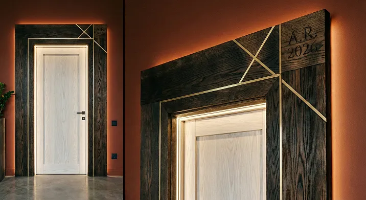 Декор дверей выходит за рамки самого дверного полотна, распространяясь на наличники, порталы, надверные фрамуги, создавая целостную архитектурную композицию. Контрастные сочетания — белый наличник на тёмной стене, чёрный на светлой, натуральное дерево на монохромном фоне — создают графичные рамки, привлекающие внимание, зонирующие пространство. Персонализированный декор отражает индивидуальность обитателей: резные орнаменты для любителей классики, минималистичные профили для ценителей простоты, широкие архитектурные порталы для поклонников монументальности. Наличник становится языком, на котором говорит интерьер.
