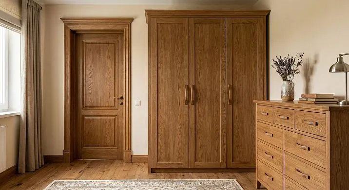 Да, и именно это создаёт цельный интерьер. Одна порода — дуб или бук — для наличников и ручек комода обеспечивает визуальную рифму между дверным проёмом и мебелью. Даже если они стоят на разных стенах — взгляд улавливает повтор.