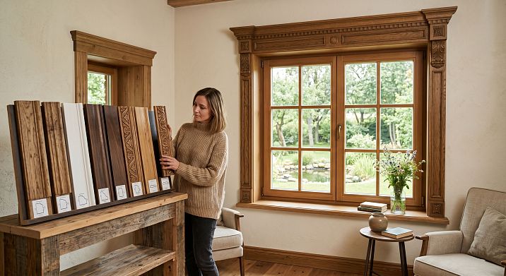 Для деревянного дома оптимальны изделия из того же или близкого материала — дуб, бук, сосна. Для фасада с декором — резные наличники с орнаментом в традиционном или авторском стиле. Для интерьера — фигурный или гладкий профиль в зависимости от стилистики.