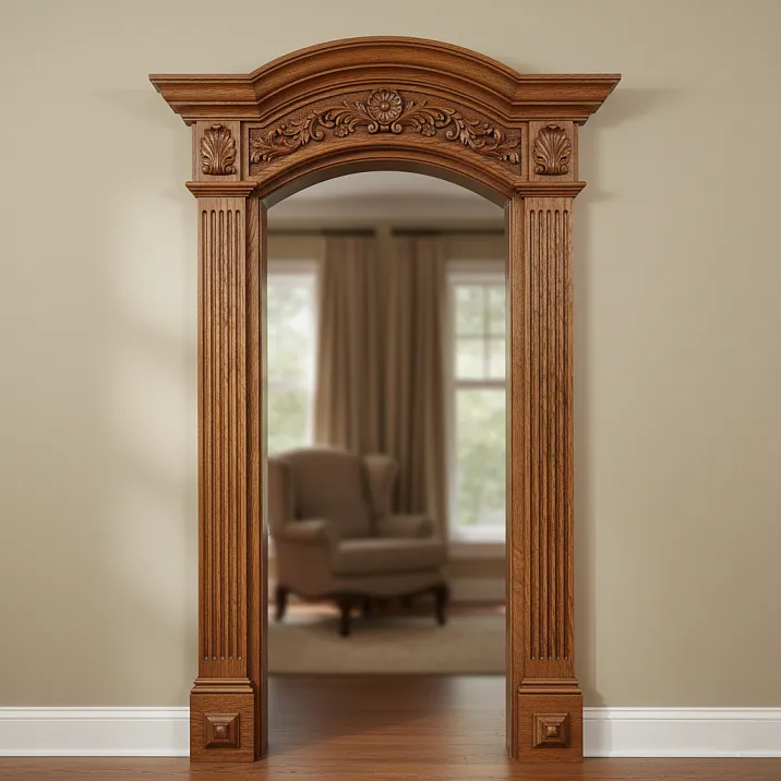 Фигурные профили с каннелюрами, филенками и другими декоративными элементами представляют собой вершину столярного мастерства. Каждый элемент профиля тщательно прорабатывается, создавая сложную игру света и тени. Такие наличники становятся настоящими произведениями искусства и подходят для самых престижных интерьеров.