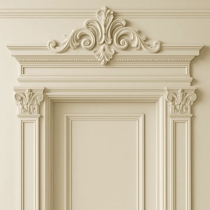 Типичные элементы классического наличника включают базу с профилированным цоколем, гладкий или каннелированный ствол, капитель с характерными для выбранного ордера деталями. Сандрик поддерживается консолями в виде волют или модульонов, создавая впечатление конструктивной логичности всей композиции.