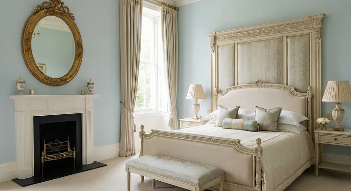 Кровать — главный предмет спальни. И изголовье кровати — визуальный центр, вокруг которого выстраивается вся композиция. В неоклассической спальне изголовье часто декорируется молдингами, создающими архитектурную структуру, классическую элегантность, визуальную завершенность.
