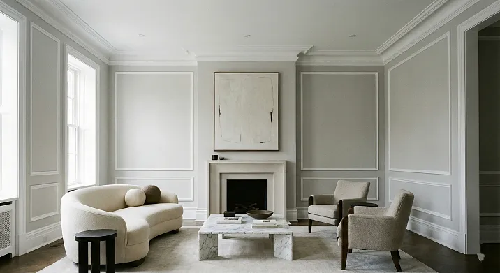 Цветовое решение молдингов следует принципу тональности. Молдинги в тон стены создают деликатную структуру, которая читается через рельеф и тень, а не через цветовой контраст. Это решение для спокойных, изысканных интерьеров. Белые молдинги на цветной стене создают более выраженный графический эффект, характерный для парижских квартир и французской неоклассики. Контрастные тёмные молдинги на светлой стене — приём для современных интерпретаций, добавляющий графичности и остроты. Важно избегать золочения, серебрения, патины — эти приёмы принадлежат исторической классике, не неоклассике.