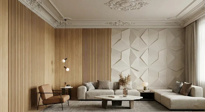 Объемный декор 2026 года – это осознанный выбор в пользу многослойности, тактильности, архитектурной выразительности. Деревянные рейки, 3D-панели и полиуретановая лепнина создают пространства, которые не просто красивы, но и функциональны, комфортны, долговечны. Рельеф работает на коррекцию пропорций, зонирование, акустический комфорт, создание фокусных точек.