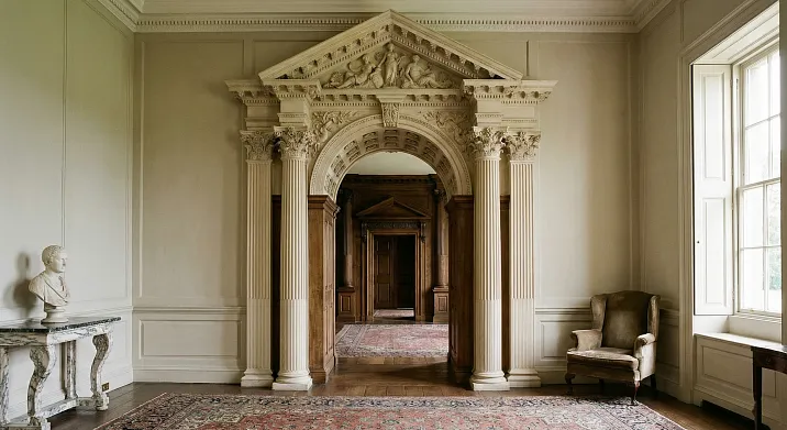 Пилястры устанавливаются по бокам проёма, сверху их венчает горизонтальный антаблемент — карниз с декоративными элементами. Такая композиция превращает простой проём в архитектурный портал. Элементы лепнины в виде пилястр, капителей, карнизов создают цельную систему.